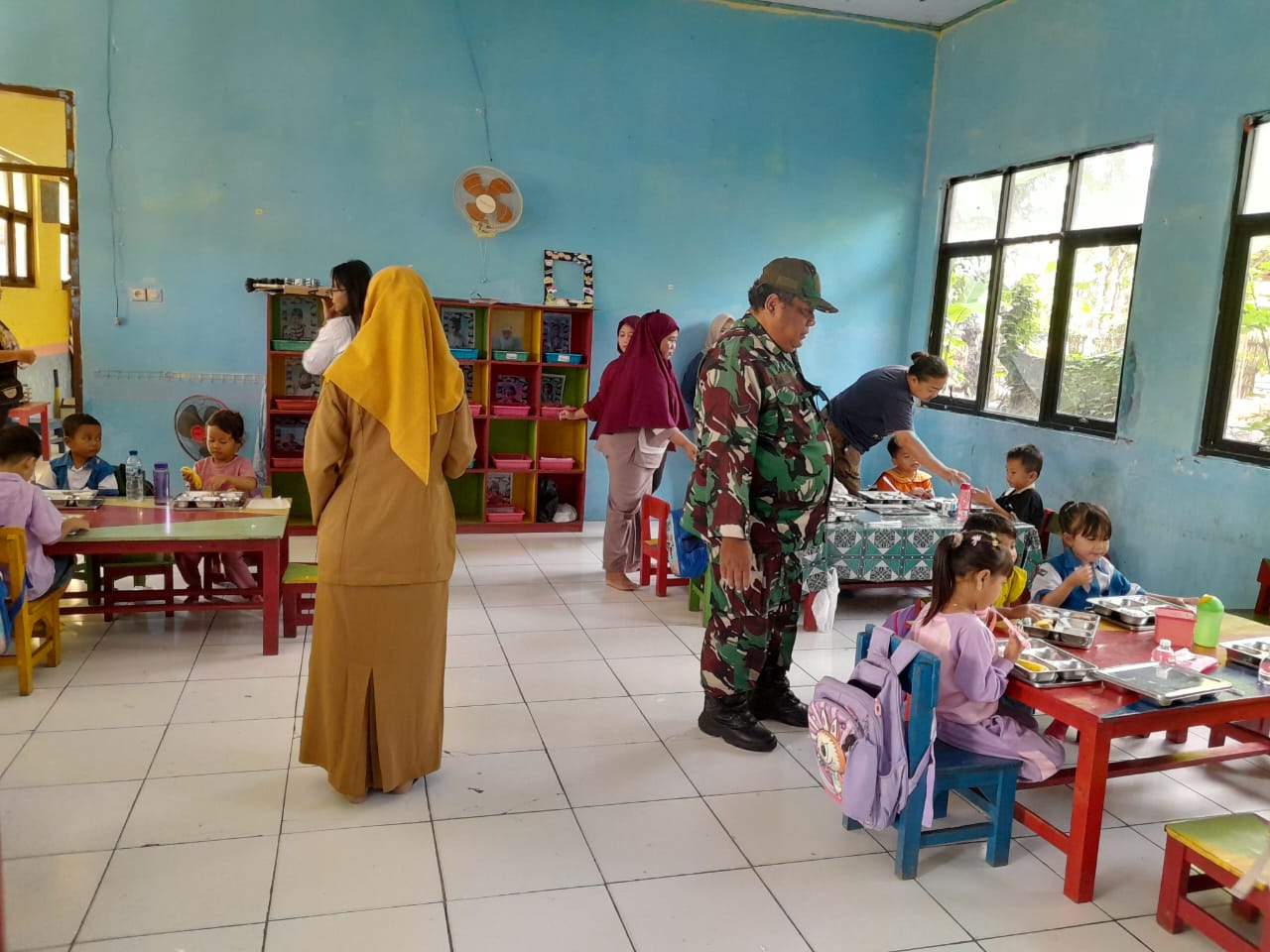 Bekasi, Pebayuran — Babinsa Koramil 11/Pebayuran, Kodim 0509/Kabupaten Bekasi mendampingi kegiatan pendistribusian makanan bergizi yang digelar oleh Satuan Pelayanan Pemenuhan Gizi (SPPG) Pebayuran, Selasa (5/8). Kegiatan berlangsung di Kp. Sayuran RT 05 RW 03, Kelurahan Kertasari, Kecamatan Pebayuran.