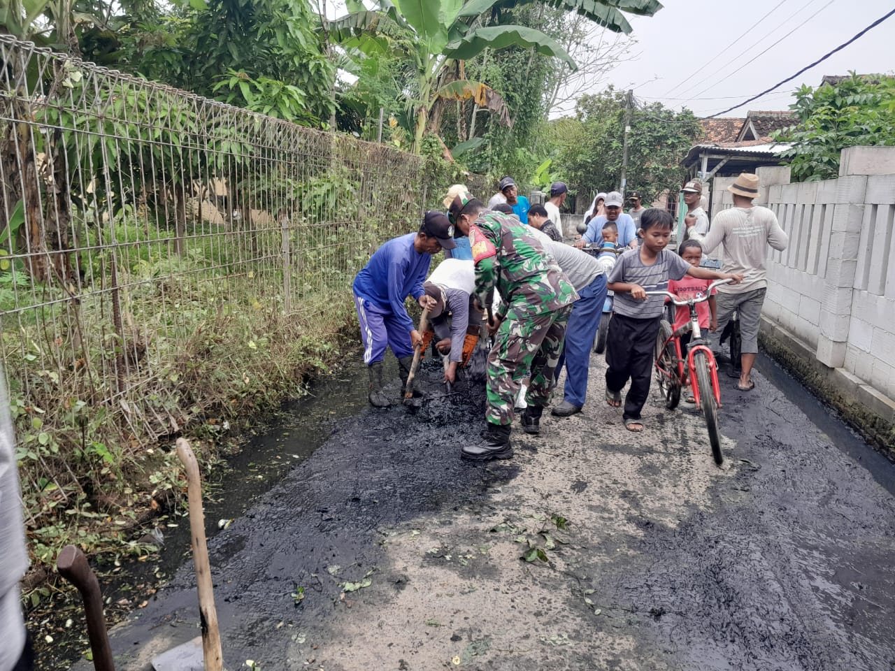 Kegiatan kerja bhakti difokuskan untuk membersihkan saluran air dan parit yang tersumbat oleh lumpur dan sampah, demi menjaga kebersihan serta kelancaran aliran air di lingkungan warga.