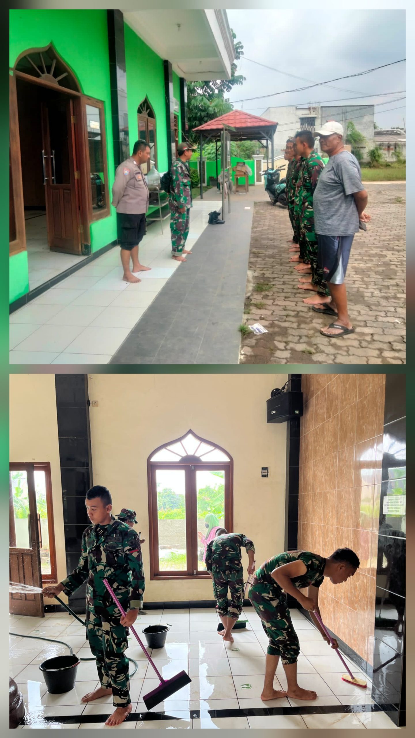 Babinsa Desa Karangsatria dari Koramil 01/Tambun, Kodim 0509/Kabupaten Bekasi, bersama anggota Yon TP 843 dan warga setempat, tampak membersihkan lumpur dan sisa-sisa material banjir yang mengotori area masjid, Meski lelah, raut wajah penuh keikhlasan dan kepedulian terlihat jelas dari seluruh peserta kegiatan.